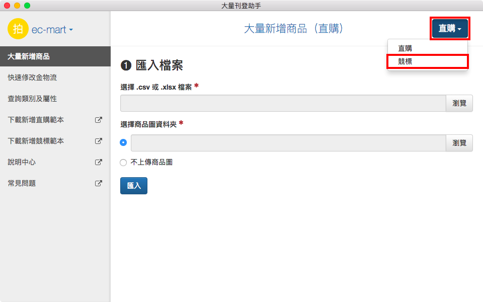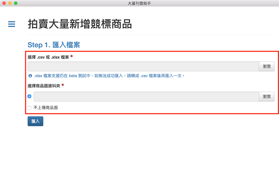 選擇 .csv 或 .xlsx 檔案和商品圖資料夾後,點選「匯入」。