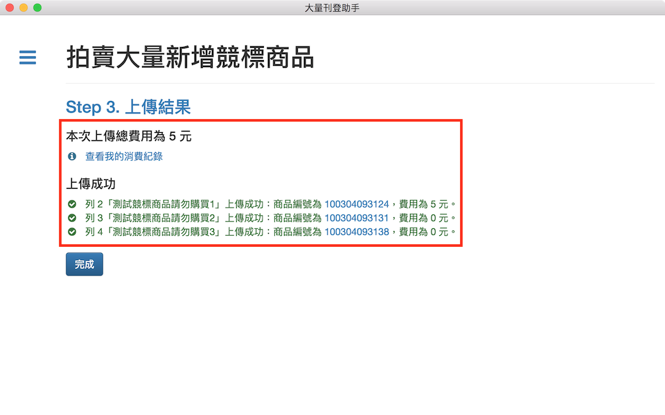 查看上傳結果,如正確無誤,按「完成」結束操作。