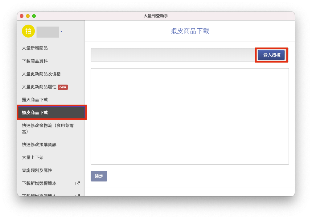 於左側導覽點選『蝦皮商品下載』,並點擊『授權登入』。