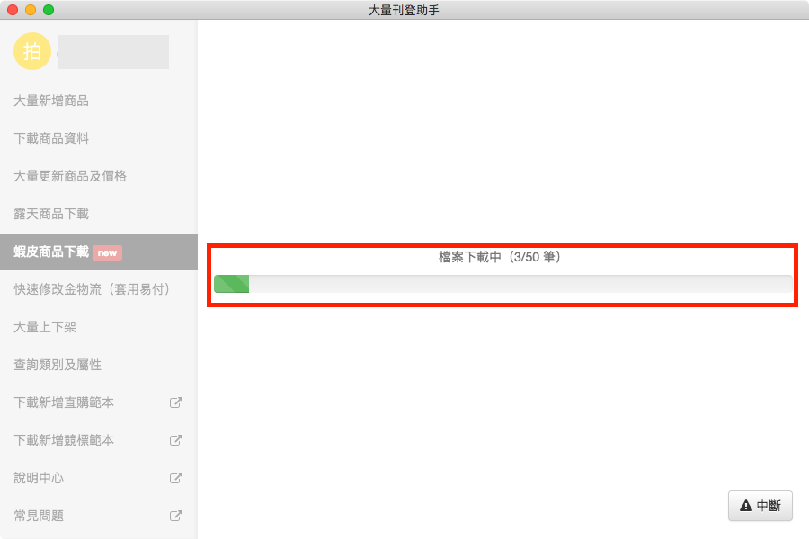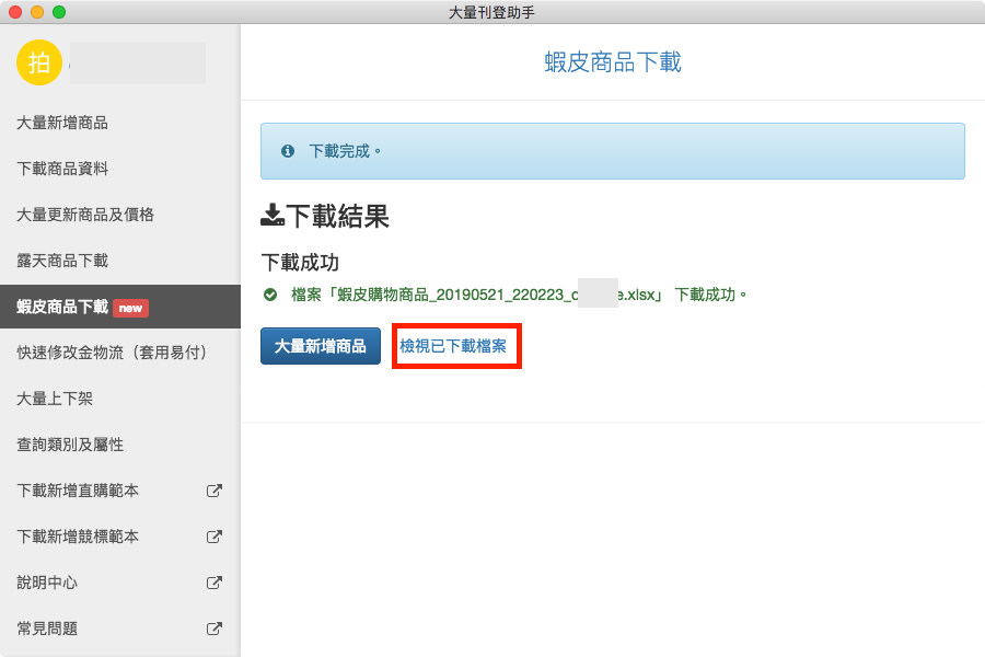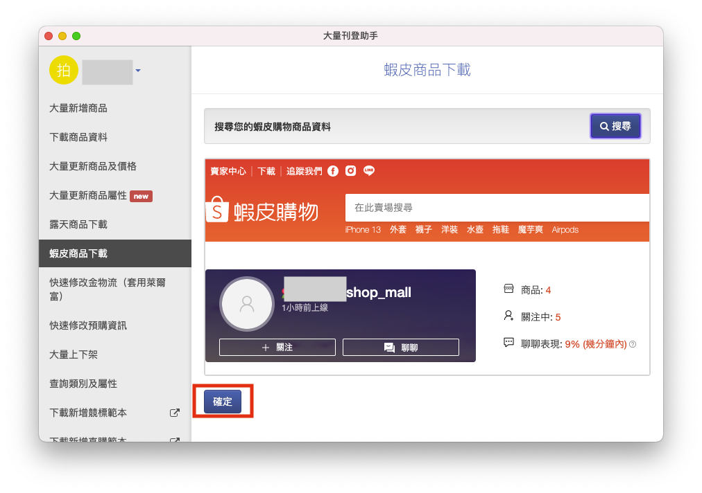 搜尋完成後,確認視窗顯示的蝦皮商店無誤後,點擊確定開始進行商品資料下載作業。