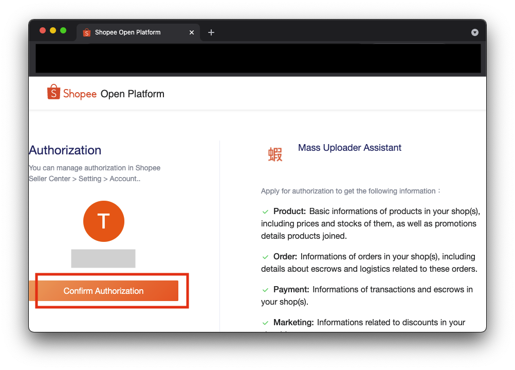 點擊Confirm Authorization (確認授權),表示您同意授權大量刊登助手存取您蝦皮商品資料的相關權限