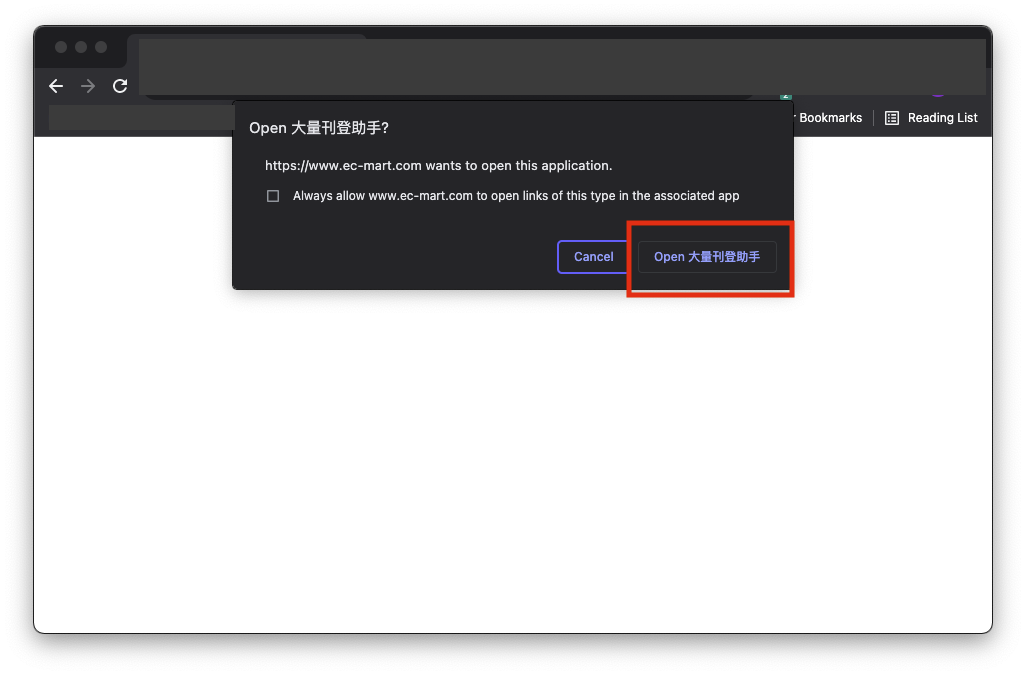 授權完成後,瀏覽器會跳出一個對話框,點擊『Open 大量刊登助手』返回拍賣大量刊登助手,並完成整個授權流程