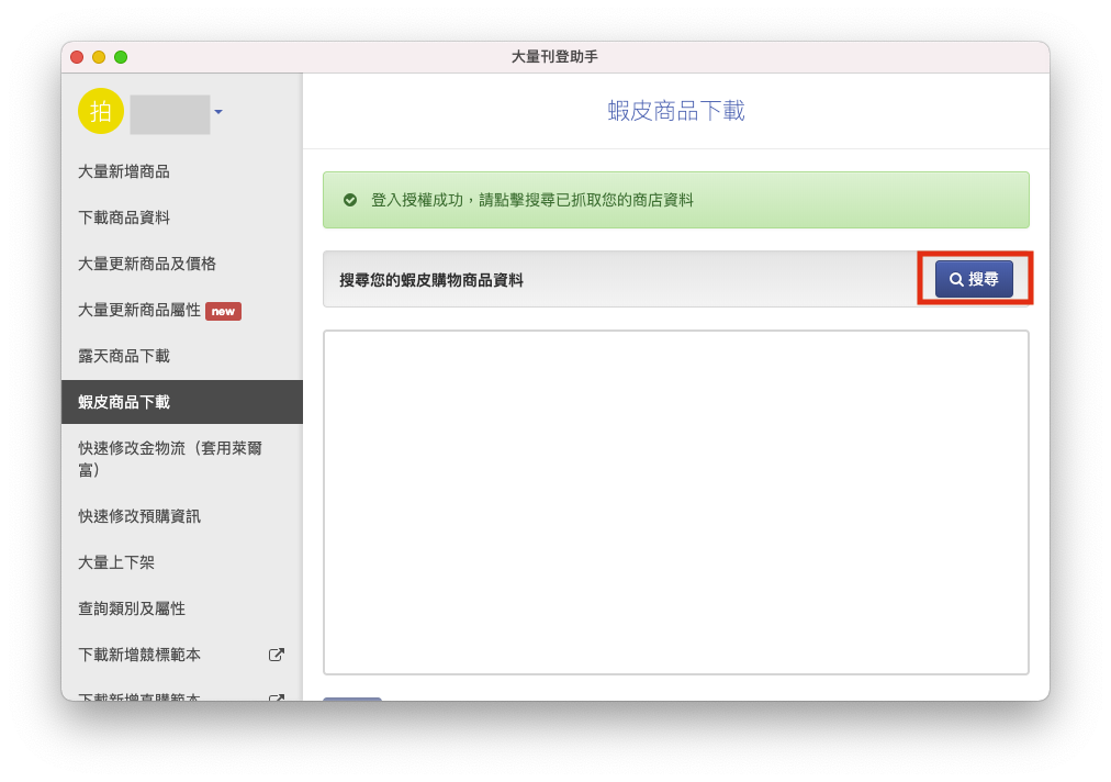 返回大量刊登助手後,會顯示登入授權已成功的訊息,點擊『搜尋』以查詢您所授權的蝦皮商店