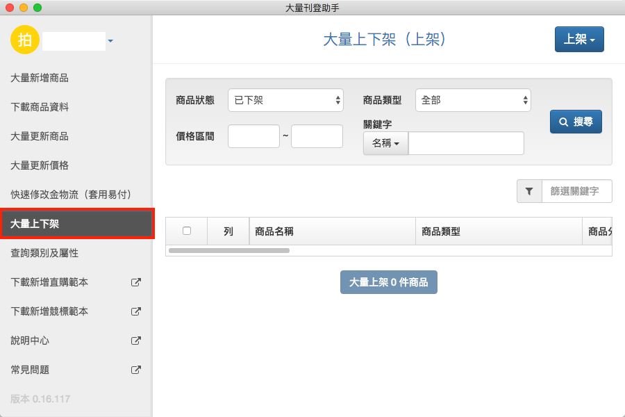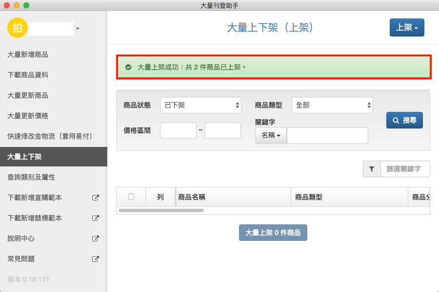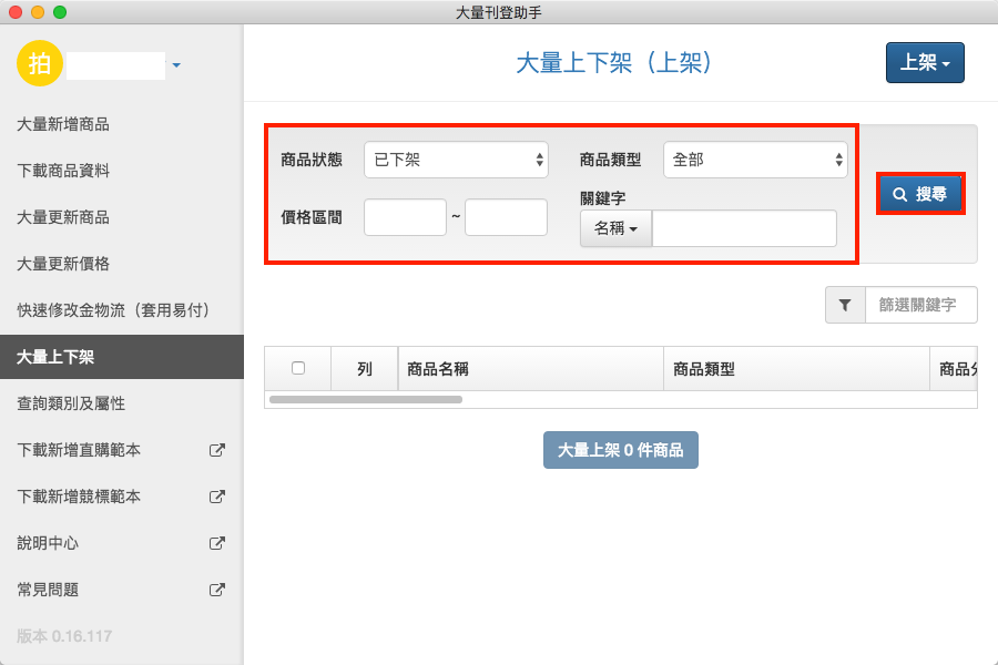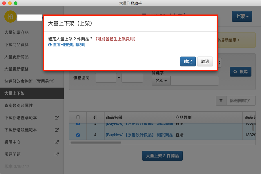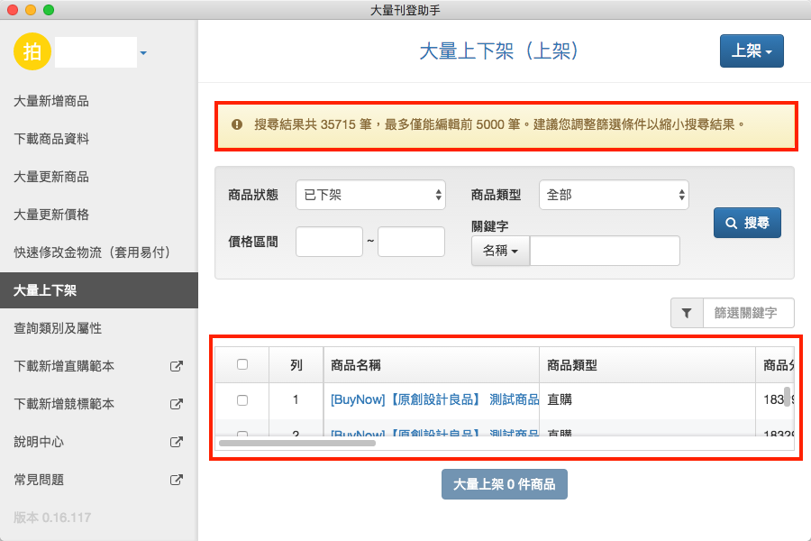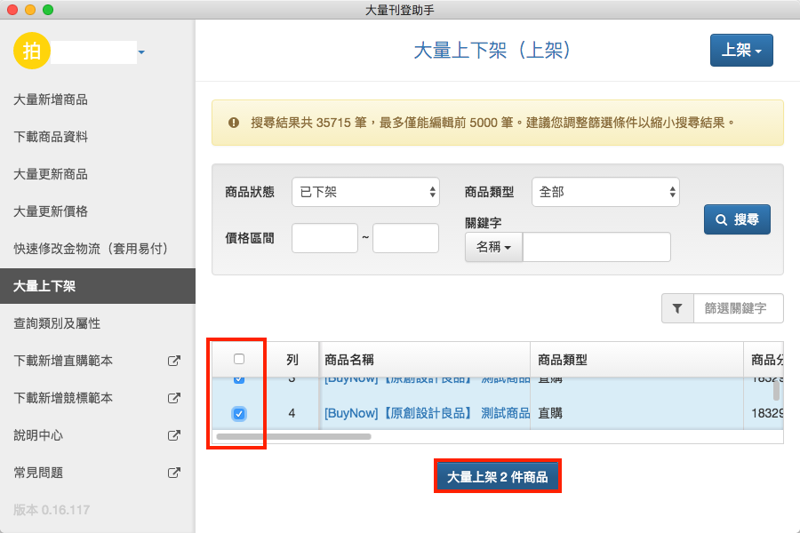 根據下方的搜尋結果,請"部份"/"全部"選擇要上架之商品。選取完成,點選「大量上架x件商品」