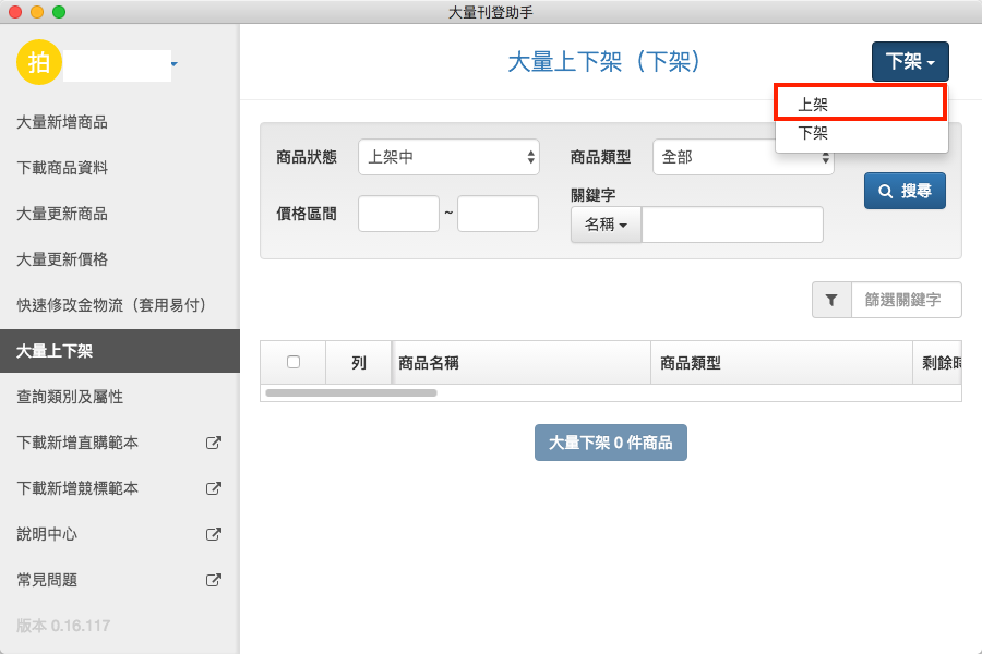 點擊標題右方選單,點選「上架」切換至新增「上架」模式。