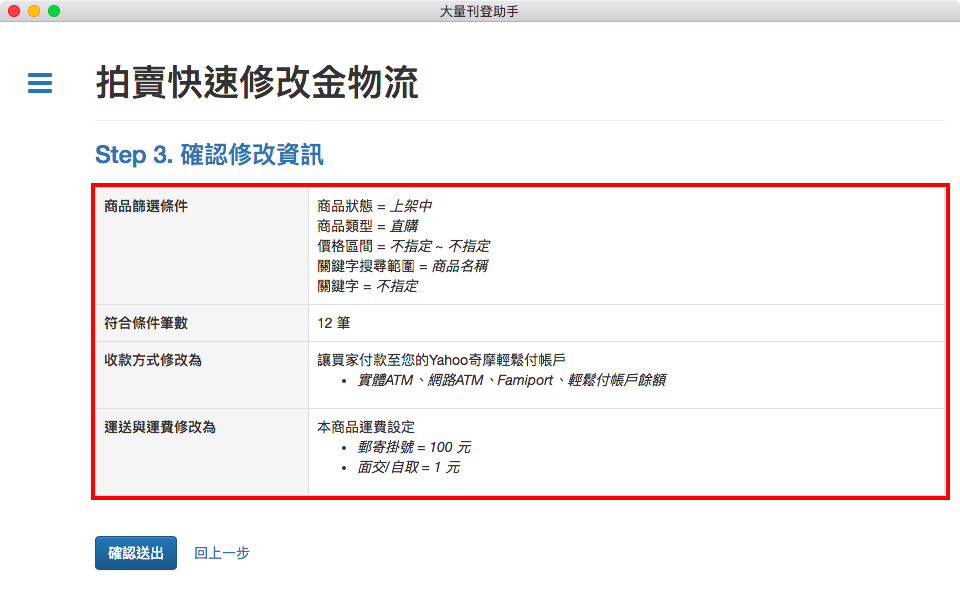 再次確認欲修改的商品對象以及金物流數值,如果正確無誤,按「確認送出」。